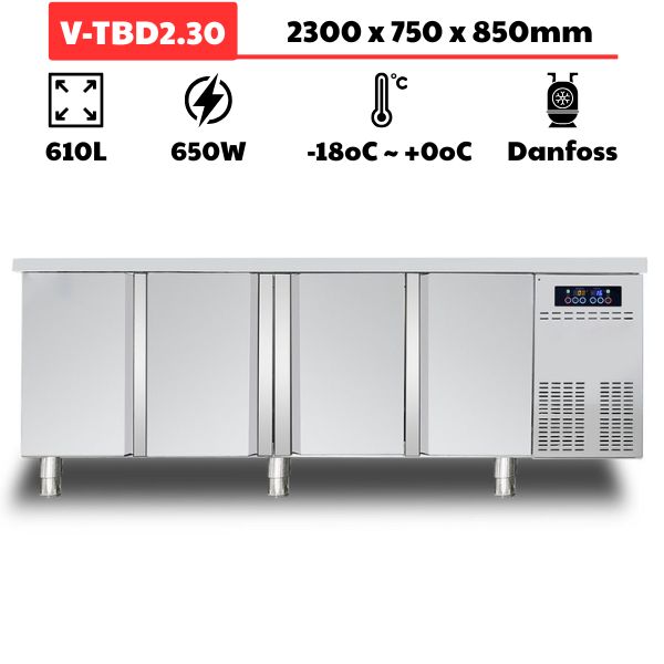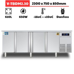 Bàn đông 4 cánh inox 2300mm sử dụng dàn lạnh quạt gió với nhiệt độ giao động từ -18 độ C ~ +0 độ C. Với mức nhiệt độ này giúp cho việc bảo quản các thực phẩm tươi sống như thịt cá vẫn đảm bảo độ tươi ngon và đảm bảo an toàn thực phẩm. Vậy bàn đông công nghiệp của Vĩnh Hoàng Kitchens có đặc điểm gì nổi bật? Hãy cùng tìm hiểu chi tiết ở bài viết dưới đây nhé.