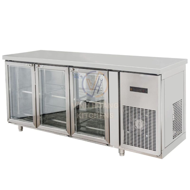 Bên cạnh đó, bàn mát cánh kính có thể được sử dụng trong các khách sạn và resort để cung cấp dịch vụ minibar cho khách hàng, giúp bảo quản và trưng bày các đồ uống và thức ăn tươi ngon trong phòng. Bàn mát Vĩnh Hoàng Kitchens thường có tính năng kiểm soát nhiệt độ và đảm bảo đáp ứng tiêu chuẩn an toàn thực phẩm.