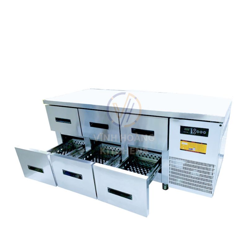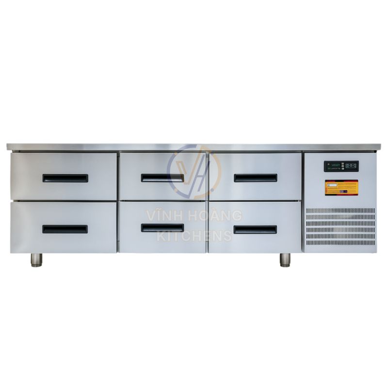 Với dung tích 400L cùng thiết kế 6 ngăn kéo inox rộng rãi, bàn mát V-TBLNK1.8 mang lại giải pháp tối ưu cho nhiều mô hình bếp công nghiệp: