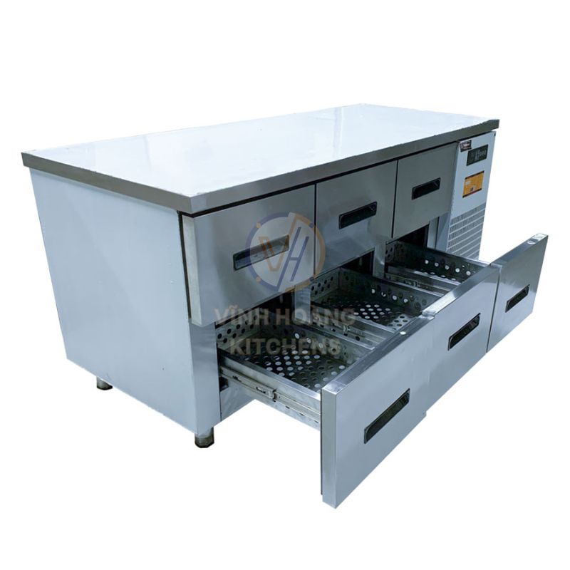 Thiết bị giúp bảo quản cùng lúc nhiều loại thực phẩm như rau củ, hải sản, thịt cá và đồ uống. Hệ thống ngăn kéo cho phép phân loại rõ ràng từng nhóm nguyên liệu, giúp đầu bếp thao tác nhanh chóng và tiết kiệm thời gian trong giờ cao điểm.