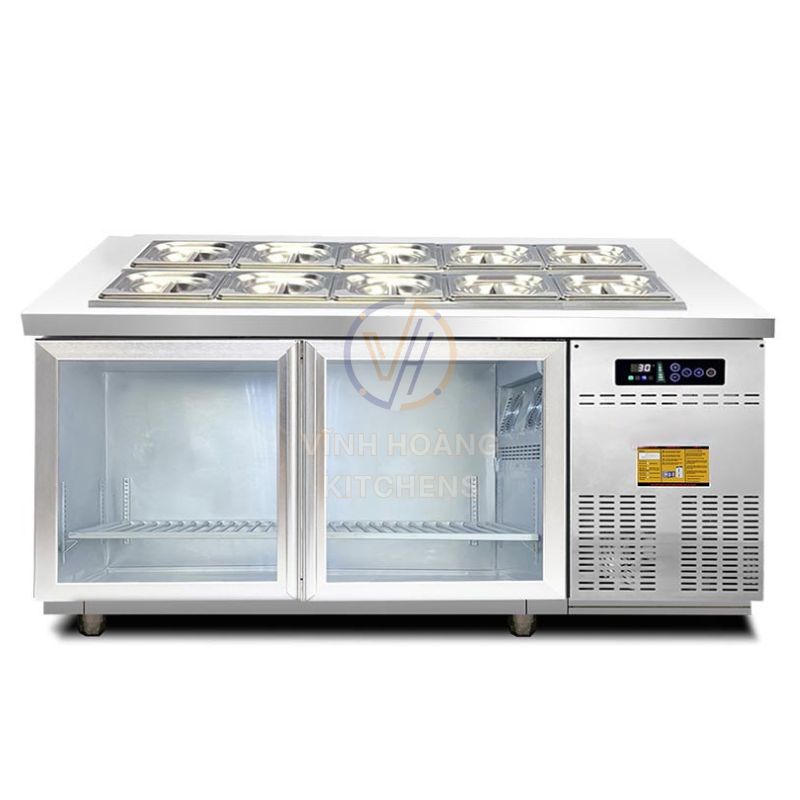 Bàn salad 2 cánh kính 1500mm Vĩnh Hoàng Kitchens còn có mặt bàn được tăng cứng, người dùng có thể sử dụng như một bàn sơ chế chuyên nghiệp. Bạn có thể thoải mái băm, chặt, sơ chế thực phẩm trên mặt bàn một cách tiện lợi nhất.