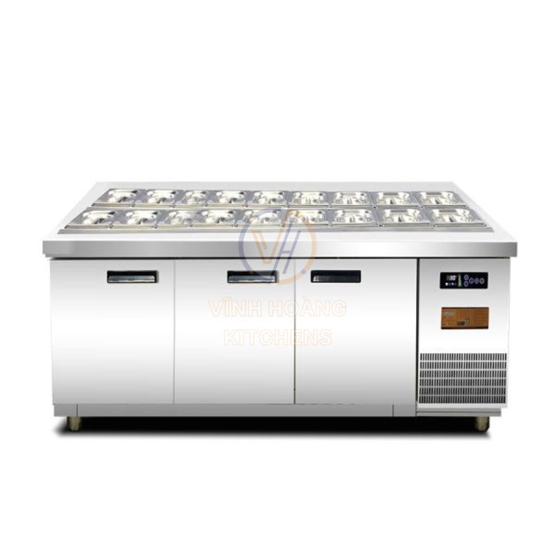 Bàn còn được thiết kế theo dạng tủ bàn hiện đại, tích hợp nhiều tầng giá tiện lợi giúp tối ưu không gian lưu trữ. Đặc biệt, tầng khay salad được bố trí linh hoạt, có thể tùy biến số lượng và kích thước theo nhu cầu thực tế sử dụng.