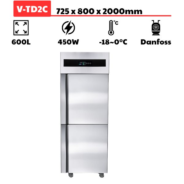 Tủ đông 2 cánh inox 600L quạt gió sở hữu công nghệ làm lạnh tiên tiến, đáp ứng tốt nhu cầu bảo quản kem, thịt cá, đồ đông lạnh, xương, thịt, hải sản, đồ khô,…trong thời gian dài mà vẫn giữ được vị tươi ngon. Với nhiệt độ ổn định -18oC ~ 0oC, tủ đông của Vĩnh Hoàng Kitchens giúp tiết kiệm đến 50% điện năng.