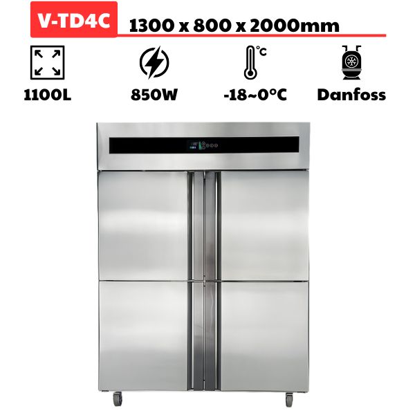 Tủ đông 4 cánh inox 1100L quạt gió sở hữu công nghệ làm lạnh tiên tiến, đáp ứng tốt nhu cầu bảo quản kem, thịt cá, đồ đông lạnh, xương, thịt, hải sản, đồ khô,…trong thời gian dài mà vẫn giữ được vị tươi ngon. Với nhiệt độ ổn định -18oC ~ 0oC, tủ đông của Vĩnh Hoàng Kitchens giúp tiết kiệm đến 50% điện năng.